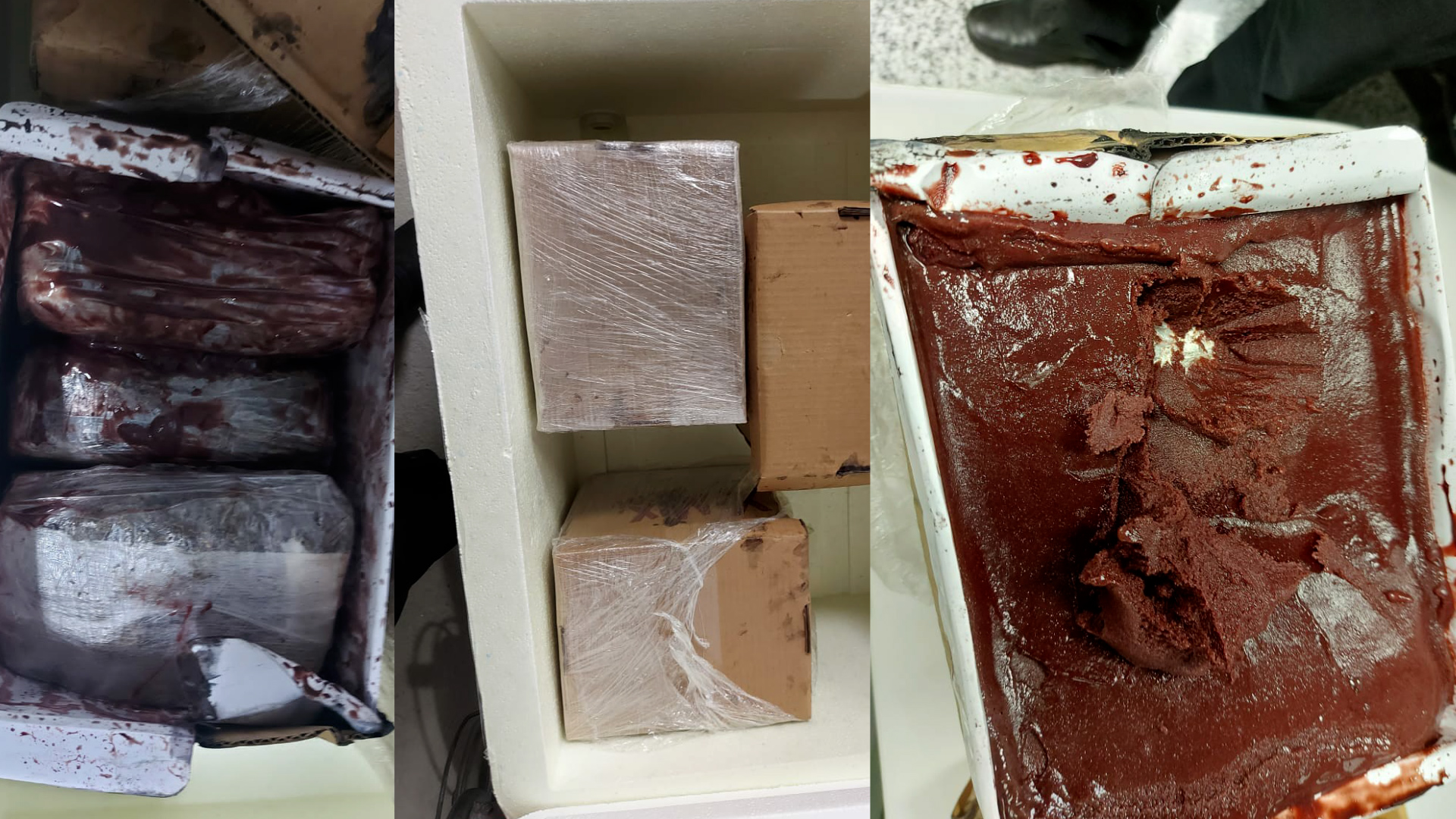 Após entrevista realizada pela equipe, a bagagem da passageira foi verificada, tendo sido encontrados no interior do isopor que havia sido despachado, três potes de açaí,sete quilos de matéria vegetal prensada em barras semelhante a “skunk” (um tipo de maconha com maior teor de substâncias psicoativas).