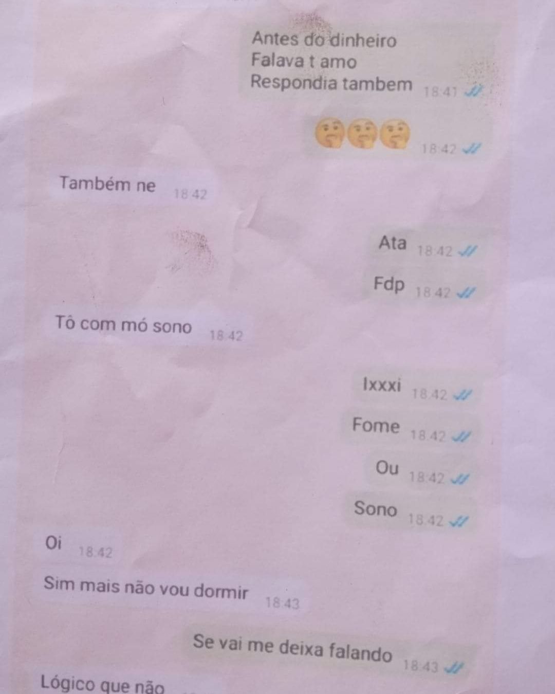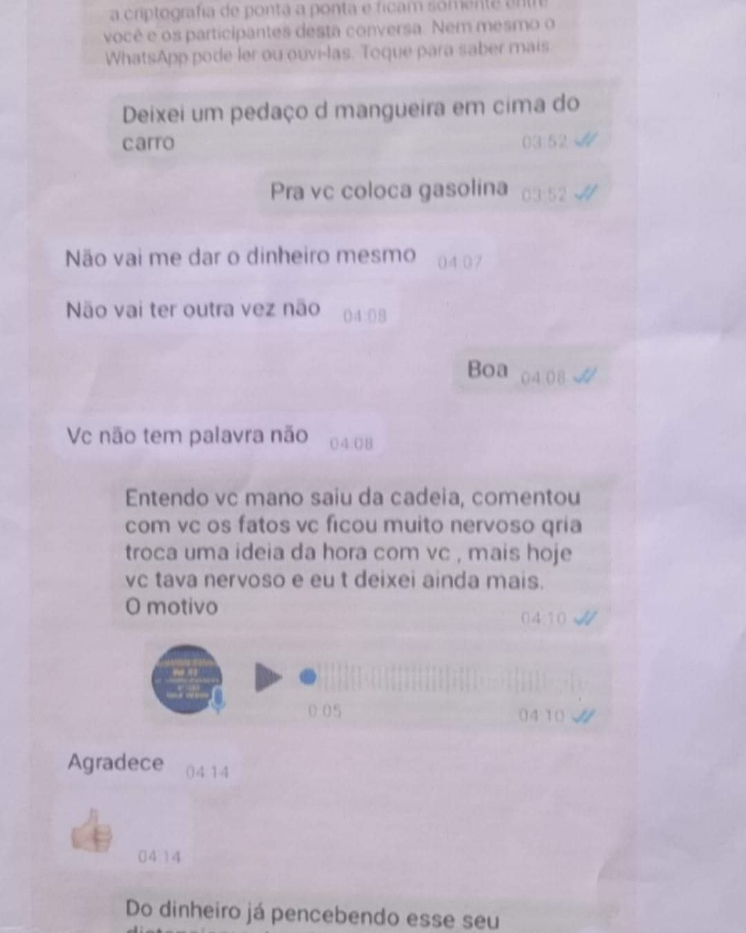 Nos prints divulgados por Camila, Juninho Virgilio (genro) e Edielson Oliveira (sogro) trocam declarações picantes e conversam sobre empréstimos de dinheiro. Em um trecho da conversa, Edielson chega a cobrar reciprocidade do genro: “Antes do dinheiro falava ‘te amo’, respondia…”.