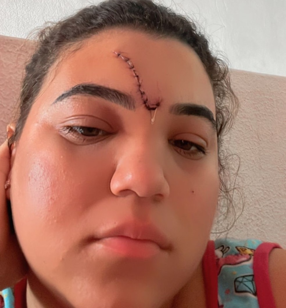 Larissa afirmou que teve que levar nove pontos na testa. “A médica disse que seis camadas de pele foram atingidas. Eu estava jorrando sangue e já estava perdendo os sentidos. O ferimento foi perto do olho, mas só atingiu a testa. Meus olhos e nariz estão inchados por causa do trauma”, declarou.