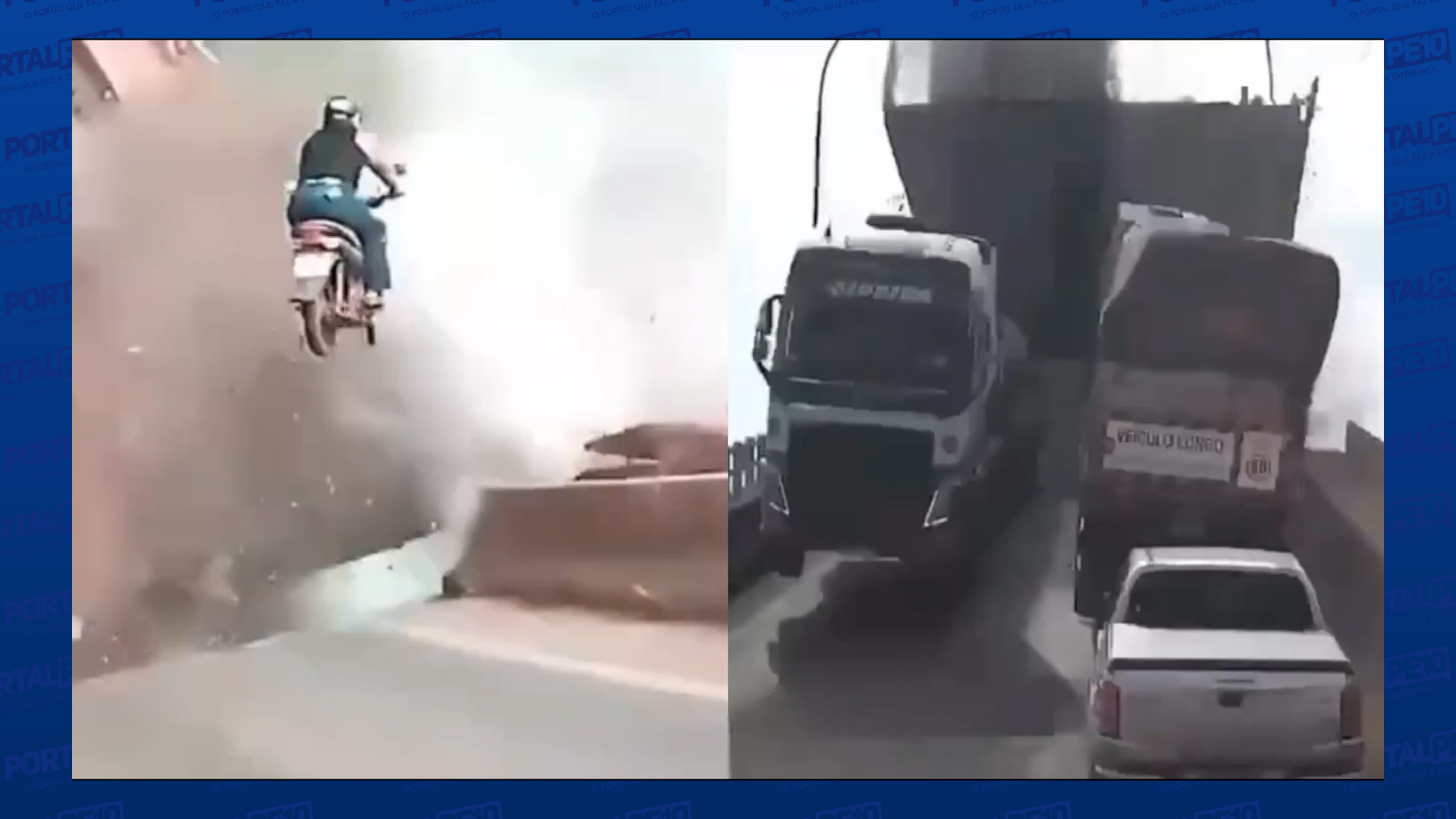 O material, publicado por perfis locais, mostra o fluxo de veículos seguindo normalmente até o colapso repentino do vão central. Caminhões e uma motocicleta aparecem sendo arrastados com a queda da estrutura.