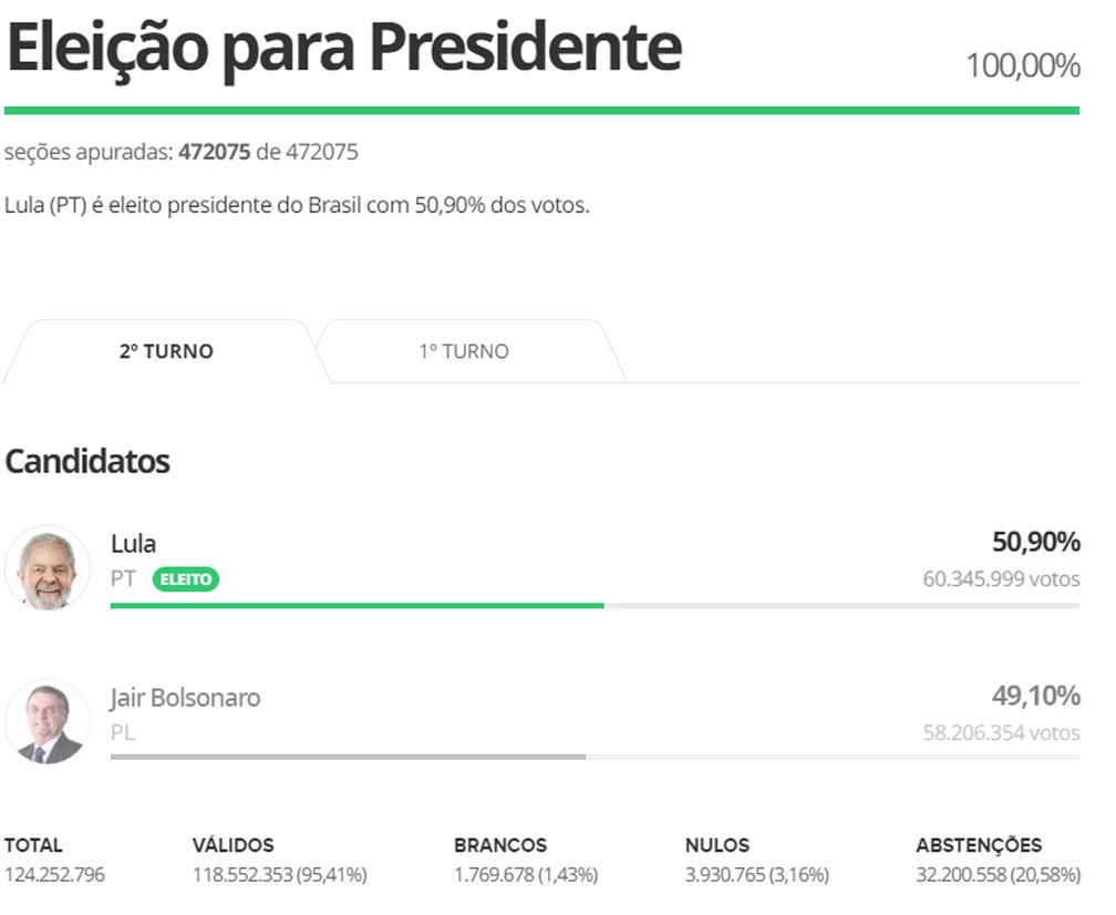 A vitória de Lula foi confirmada pelo Tribunal Superior Eleitoral (TSE) quando havia 98% das urnas apuradas, às 19h57. Àquela altura, ele tinha 50,83% dos votos válidos e não poderia mais ser alcançado por Bolsonaro, que contabilizava 49,17%.