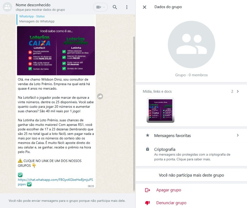 Ao ser adicionado nos grupos, que costumam aparecer com o título “Nome desconhecido”, o usuário é impedido de interagir pois é excluído logo em seguida. “Você não pode enviar mensagens para o grupo porque não participa dele”, diz o aviso.
