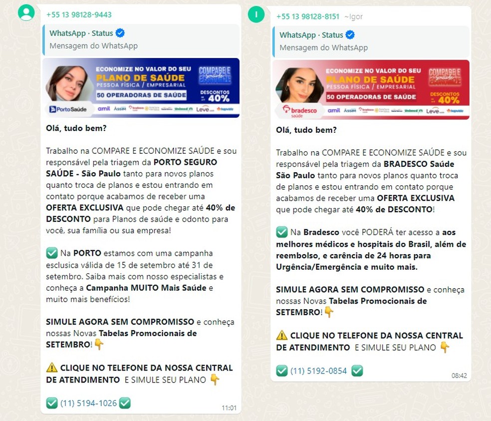 Em geral, as mensagens envolvem empresas de diferentes segmentos, como renegociação de dívidas, contratação de planos de saúde, loterias, transportadoras, lojas de suplementos e empresas de telefonia. Elas incluem ainda um número de telefone ou um link para um canal de atendimento.