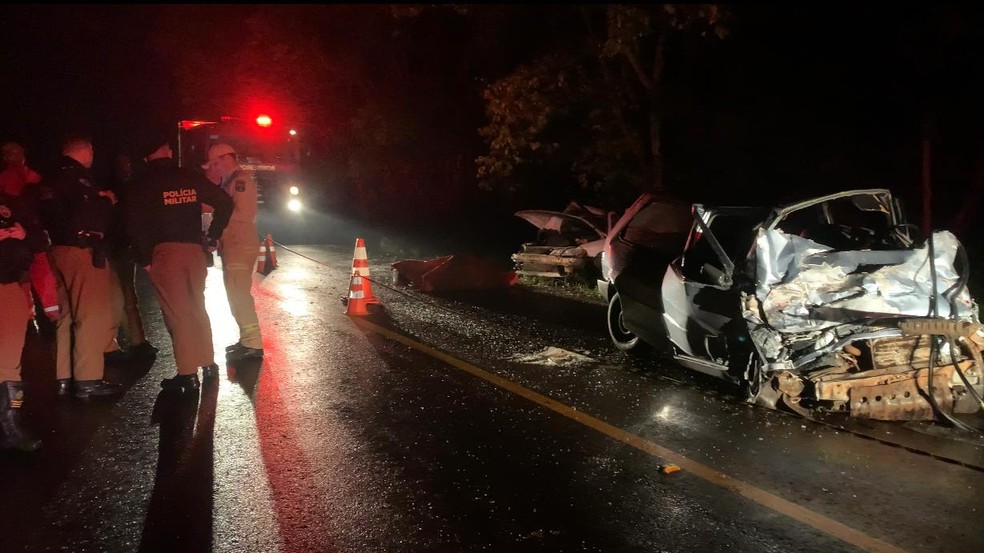 Veículos ficaram destruídos após batida em Sulina; pai e filha e casal morreram — Foto: Islan Roque/RCV