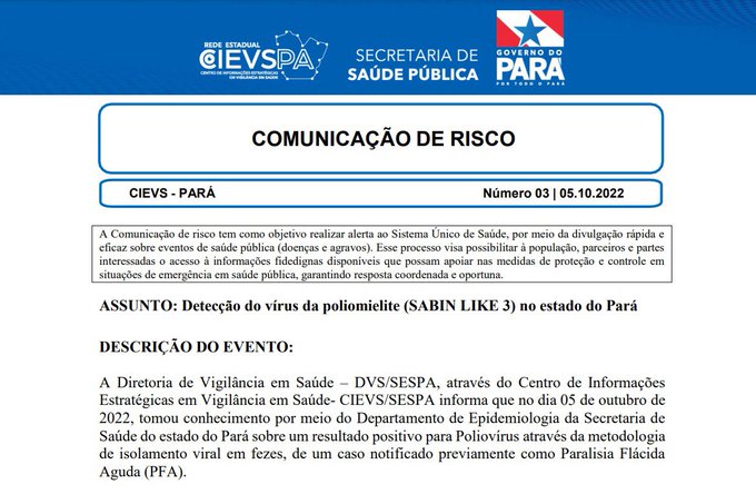 O Centro de Informações Estratégicas de Vigilância em Saúde do Pará (CIEVS/PA) confirmou, nesta quinta-feira (6), a detecção do vírus da poliomielite em uma criança de três anos. O Brasil considera ter errado a paralisia infantil há 33 anos, em 1989. O País vem registrando uma baixa procura de vacina após os discursos antivacina do presidente Jair Bolsonaro (PL).