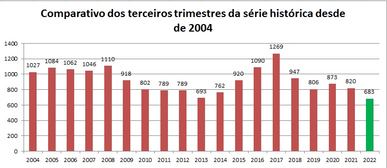 Setembro de 2022 foi o terceiro mês seguido em que Pernambuco reduziu tanto os homicídios quanto os roubos, consolidando uma tendência iniciada no segundo semestre deste ano. Nos crimes contra a vida, o recuo foi de 20% no comparativo entre setembro deste ano (222 mortes) e setembro de 2021 (278). Já nos crimes patrimoniais, a diminuição no mesmo recorte foi de 9,7%. As estatísticas também mostram que o último trimestre (julho, agosto e setembro) foi o que teve menos mortes violentas de todos os 75 trimestres existentes na linha do tempo de homicídios, iniciada em janeiro de 2004.