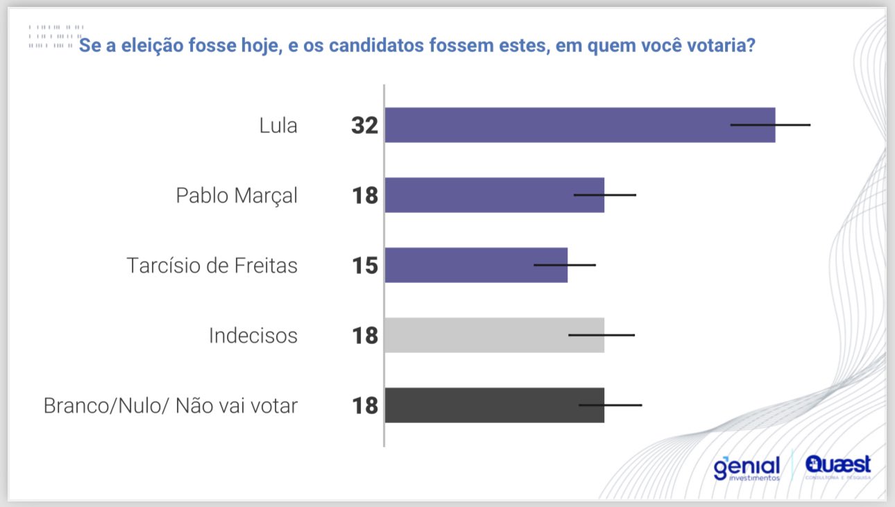 De acordo com os dados, Lula lidera com 32% das intenções de voto, seguido por Marçal com 18% e Tarcísio com 15%. A pesquisa tem uma margem de erro de 2 pontos percentuais e um nível de confiança de 95%.