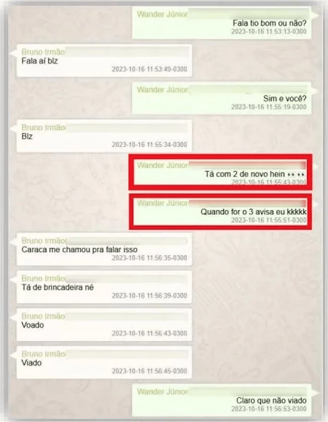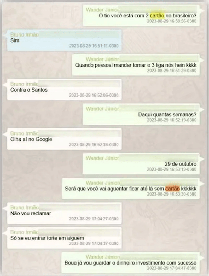 A PF identificou trocas de mensagens entre Bruno Henrique e seu irmão, Wander Nunes Pinto Júnior. No relatório, consta uma conversa entre os dois datada de 29 de agosto de 2023 — cerca de dois meses antes do confronto com o Santos.
