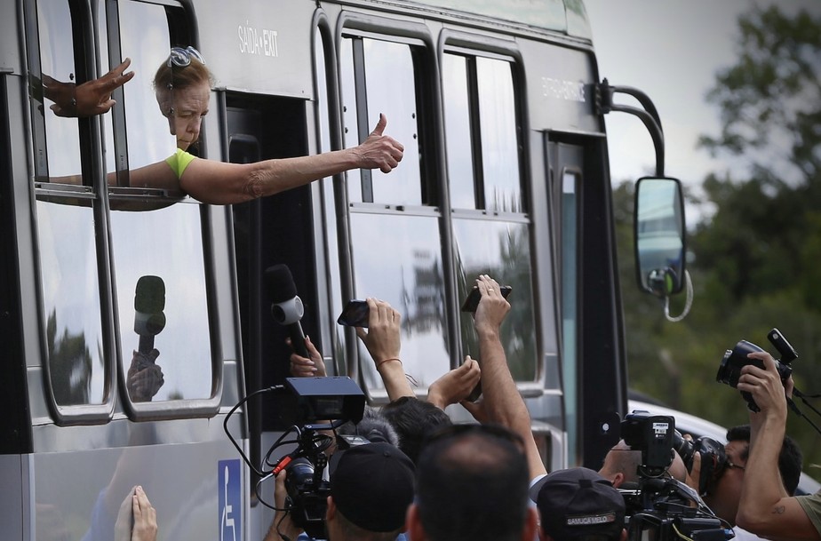 Todos estavam no acampamento montado em frente ao QG do Exército, em Brasília, quando foram levados em mais de 50 ônibus municipais escoltados pela Polícia Militar do Distrito Federal à Academia Nacional da Polícia Federal.