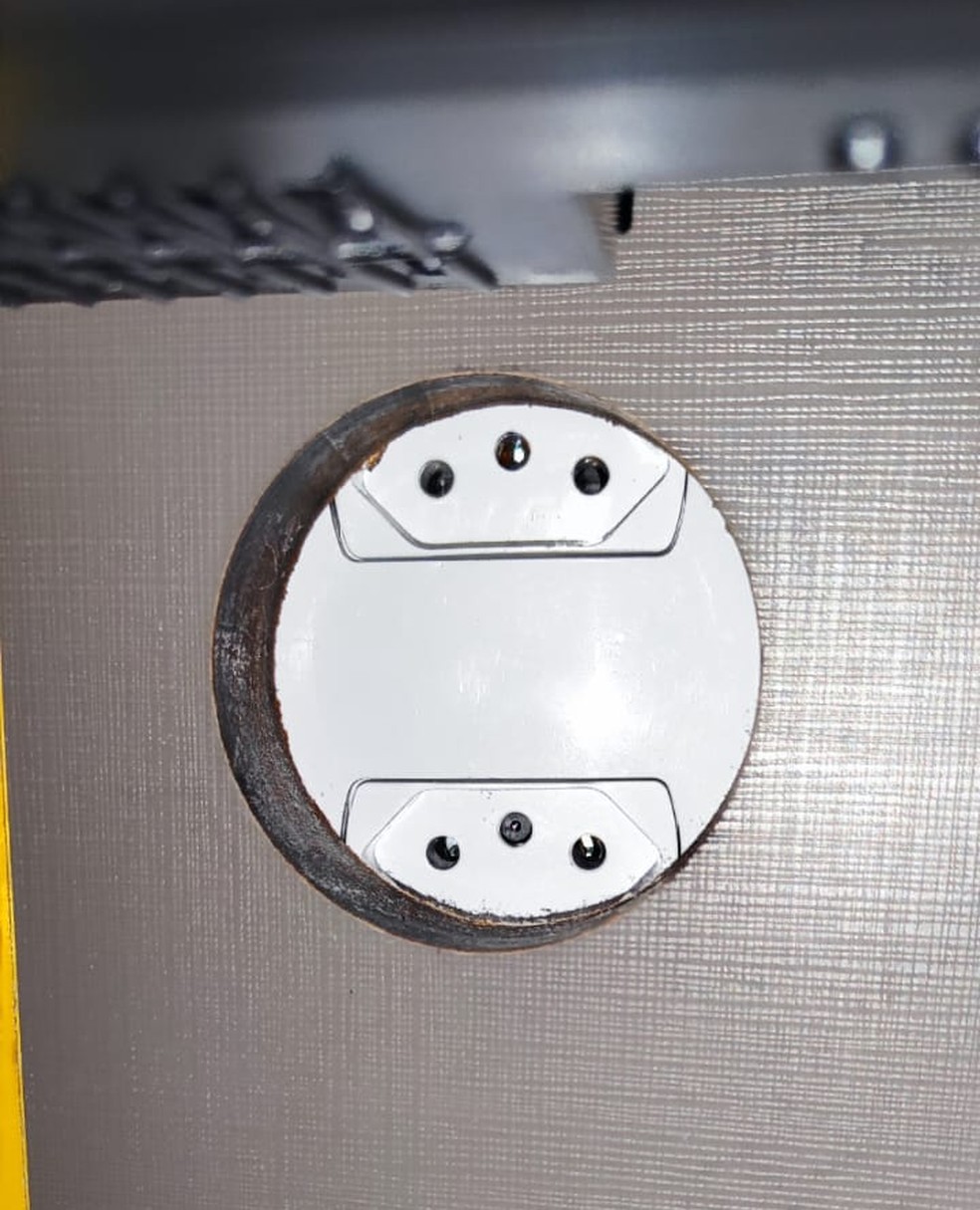 Ela encontrou o que parecia ser um receptor de tomada, mas não conseguia colocar nenhum carregador no local. Ao examinar com a lanterna do celular, percebeu que se tratava de uma câmera.