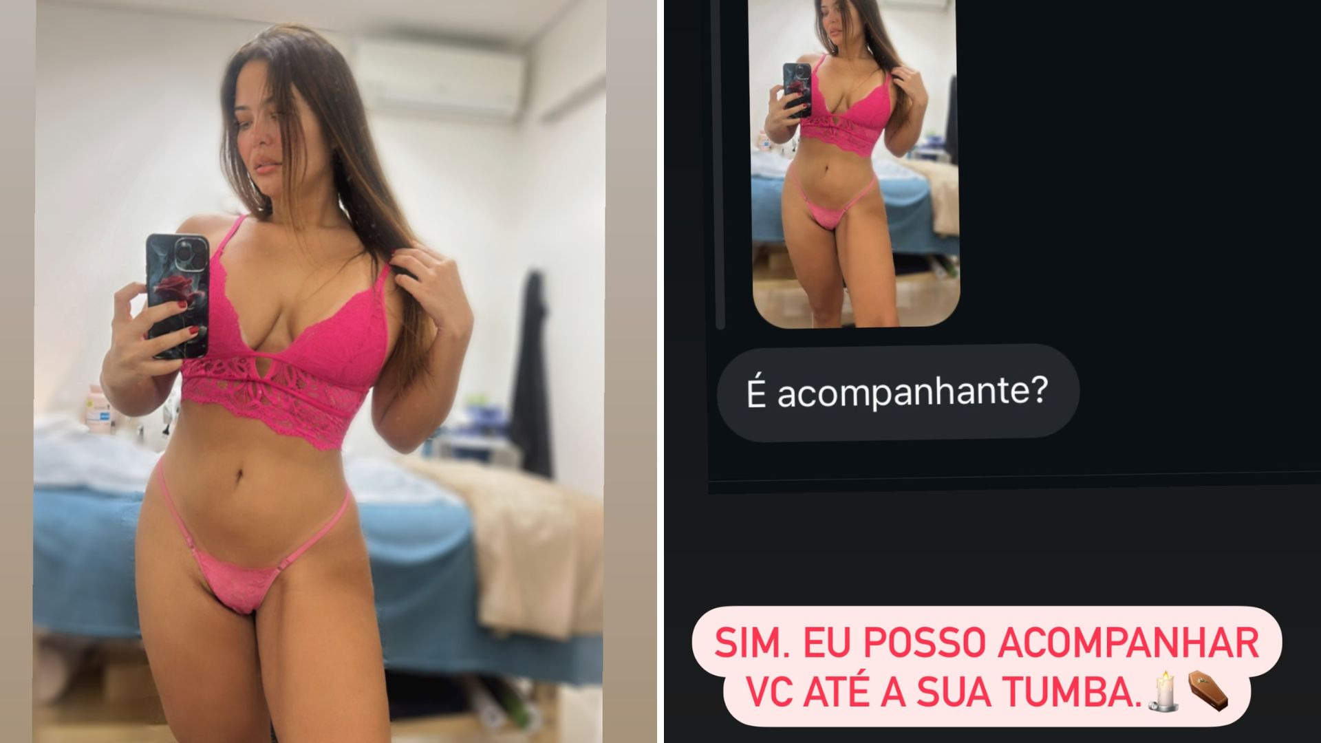 Tudo começou após Geisy publicar a foto usando uma lingerie de renda cor-de-rosa e receber a mensagem do seguidor. “Sim, eu posso acompanhar você até a sua tumba”, respondeu a influenciadora, sem papas na língua.