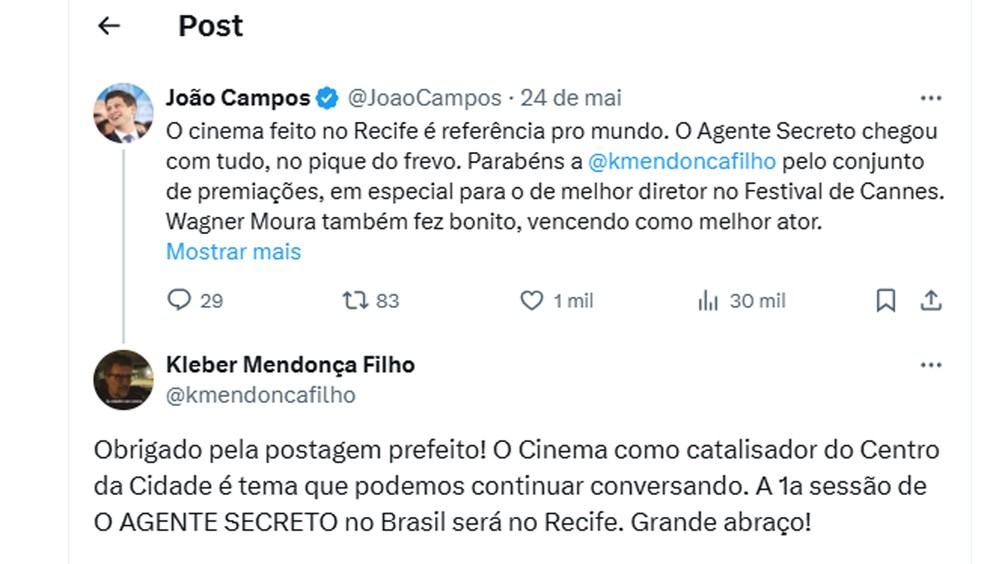 “O cinema como catalisador do Centro da Cidade é tema que podemos continuar conversando. A 1ª sessão de O Agente Secreto no Brasil será no Recife. Grande abraço!”, escreveu Kleber, respondendo um comentário do prefeito João Campos.