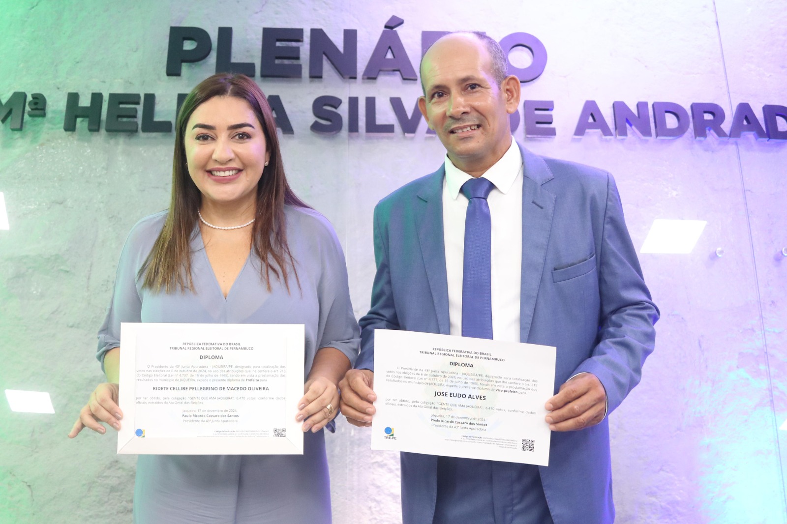 Ridete Pellegrino (PSD), primeira mulher prefeita e reeleita de Jaqueira, na Mata Sul, foi oficialmente diplomada nessa terça-feira (17), pelo Tribunal Regional Eleitoral de Pernambuco (TRE-PE). Paulo Ricardo Cassaro dos Santos, juiz da 43ª Zona Eleitoral de Catende, realizou a cerimônia na Câmara Municipal. Foram diplomados também o vice-prefeito de Jaqueira, Irmão Eudo (PSDB) e todos os vereadores.