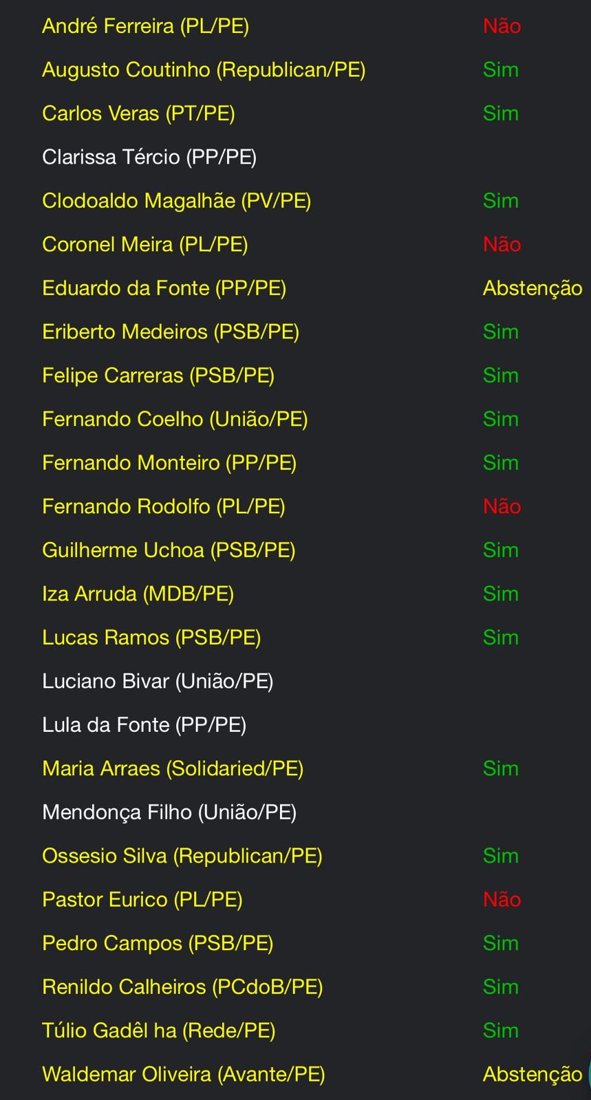 André Ferreira, Coronel Meira, Fernando Rodolfo e Pastor Eurico, do PL, votaram contra. Eduardo da Fonte (PP) e Waldemar Oliveira (Avante) se abstiveram. 4 faltaram.