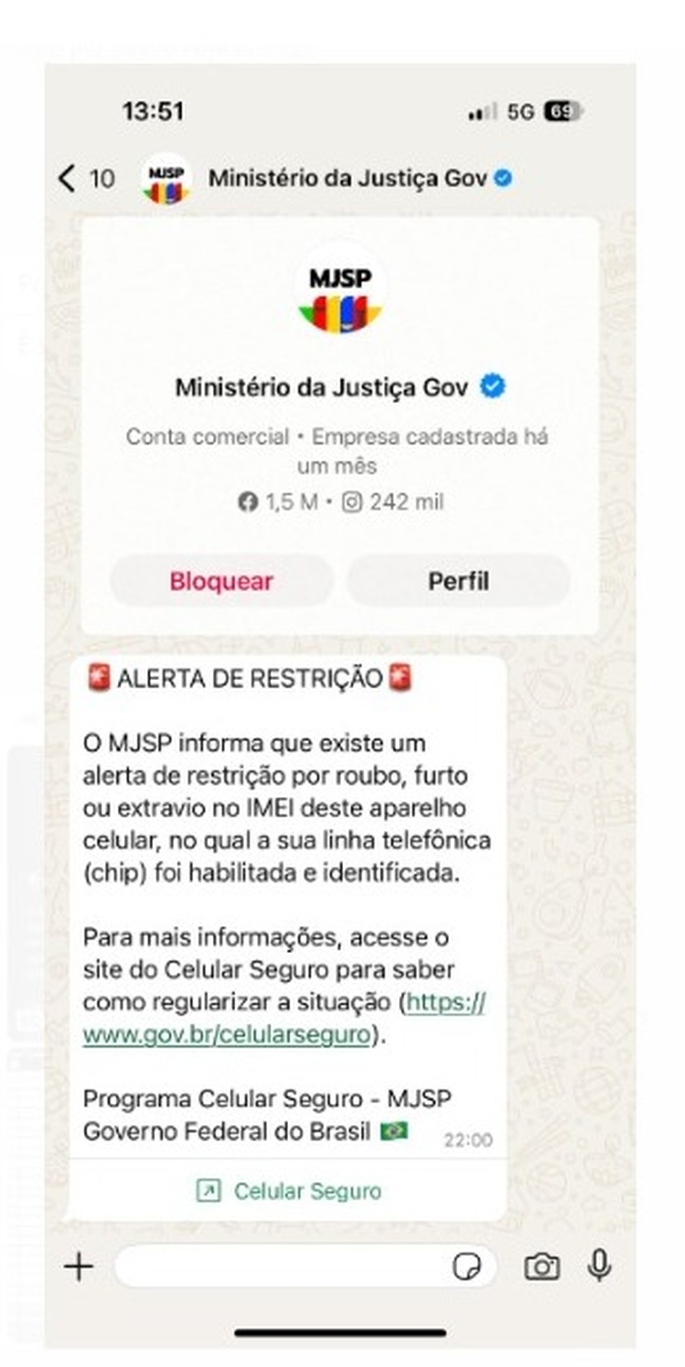 Sempre que um novo chip for inserido em um celular com registro de restrição e o aparelho voltar a se conectar à rede, o sistema envia um alerta automático ao novo número. A mensagem informa que há um bloqueio ativo sobre o IMEI — o número de identificação único do aparelho — e orienta o usuário a acessar o site celularseguro.gov.br para regularizar a situação.