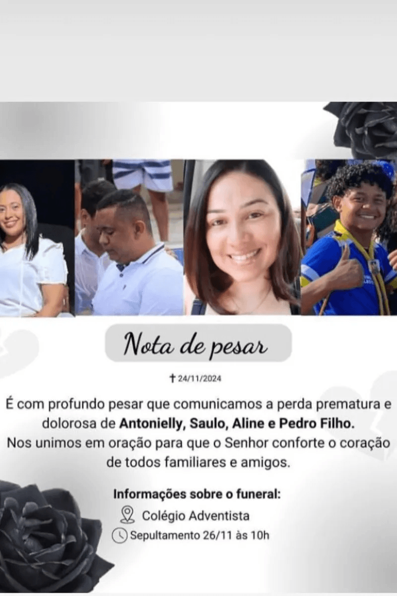 As vítimas são: Saulo Hermínio da Silva, de 24 anos; Antonielly Fernanda Américo da Silva, 31 anos; Pedro Henrique Américo da Silva Filho, de 14 anos; e Linelenes Florêncio dos Santos (Aline), 38 anos.