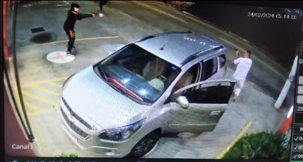 Câmera de segurança registrou o crime. PM estava no local aguardando a esposa que estava no estabelecimento.
