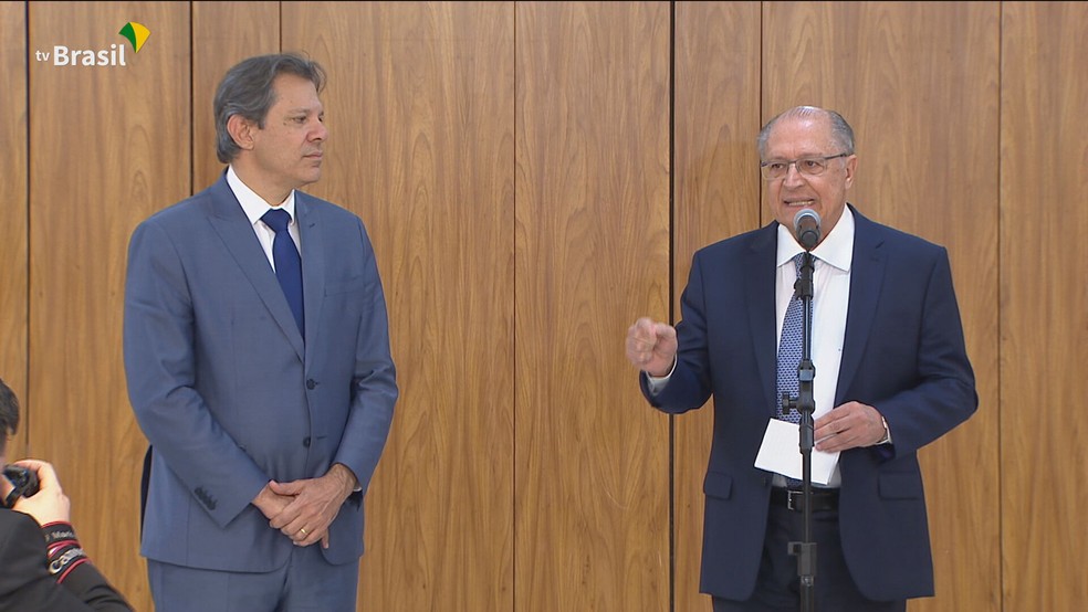 O ministro da Fazenda, Fernando Haddad, e o vice-presidente Geraldo Alckmin no anúncio do programa. — Foto: Reprodução