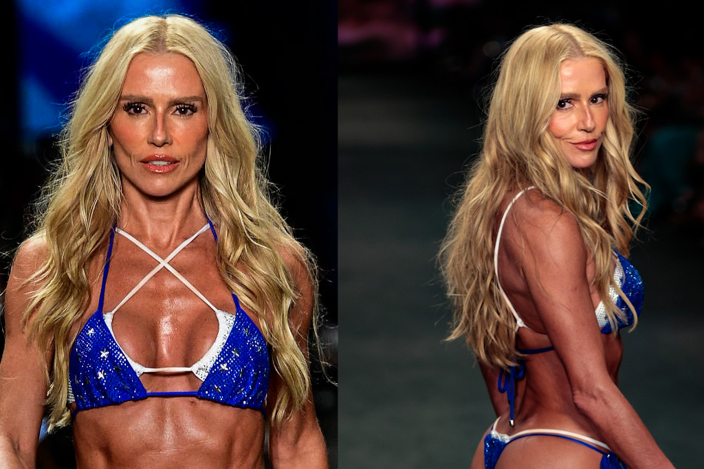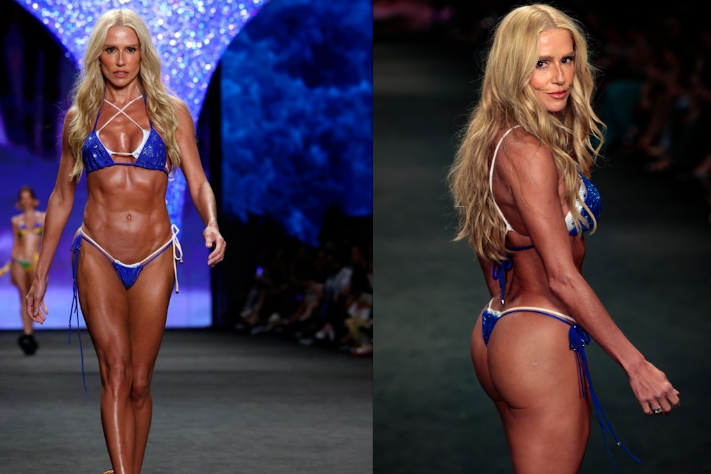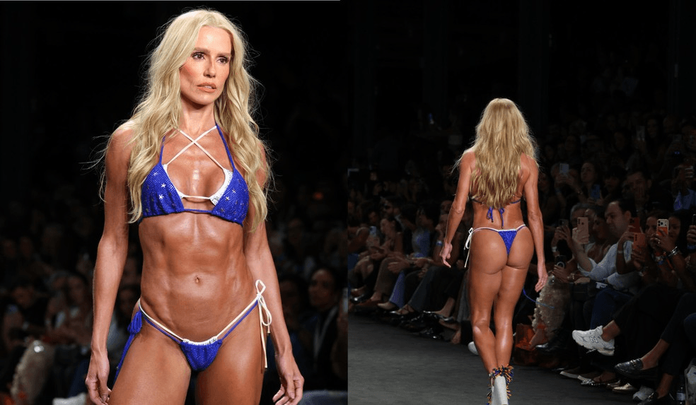 A atriz surgiu com um visual marcante durante o desfile da Blue Man, combinando microbiquíni em sobreposição com salto alto, e acabou se tornando um dos destaques da noite.