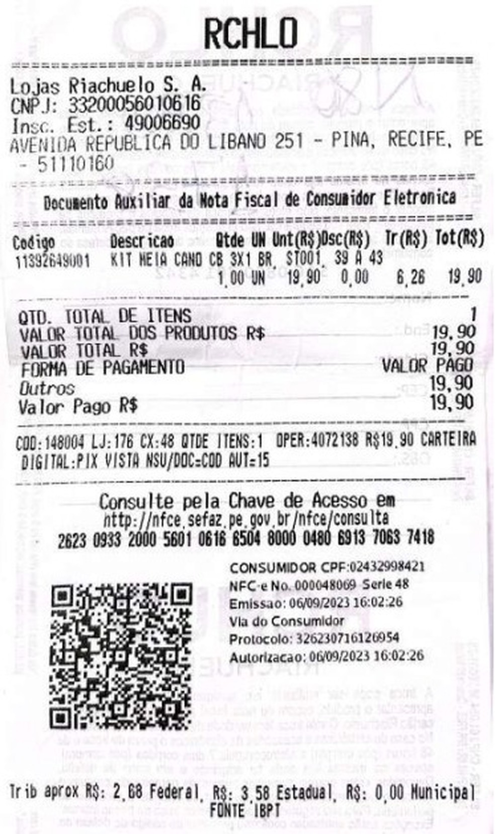 Nota fiscal de compra de meias feita por Irenildo Florêncio na loja Riachuelo do Shopping RioMar — Foto: Reprodução/WhatsApp