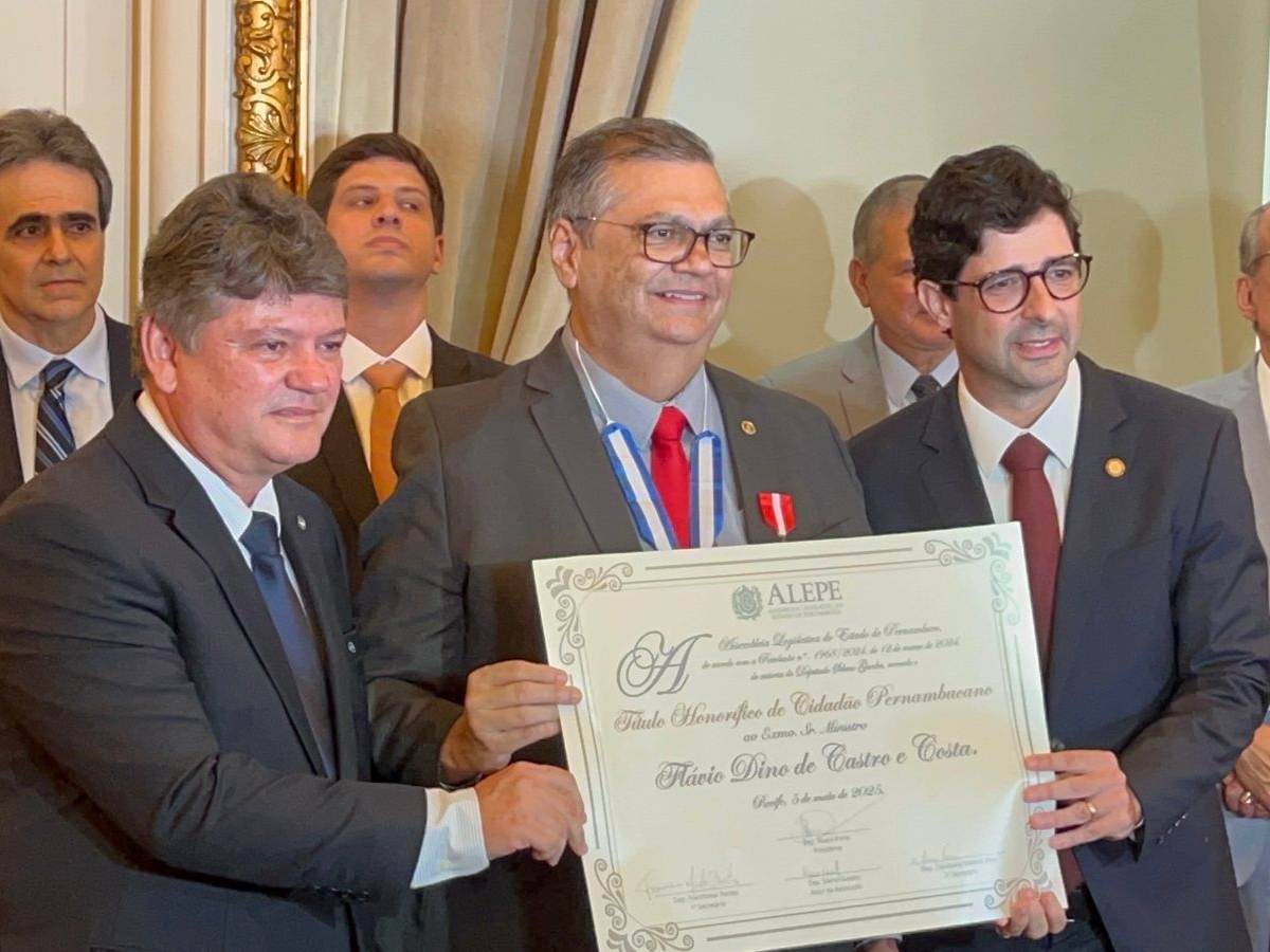 O ministro Flávio Dino, do Supremo Tribunal Federal (STF), recebeu, nesta segunda-feira (5), o título honorífico de cidadão pernambucano. A honraria, concedida pela Assembleia Legislativa de Pernambuco (Alepe), foi aprovada por unanimidade e entregue ao magistrado pelos deputados Rodrigo Farias (PSB) e Sileno Guedes (PSB).