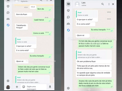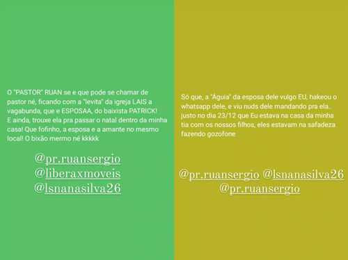 Na noite desta sexta-feira (27/12), Aryana Medeiros usou as redes sociais, neste momento com 80 mil seguidores, para se pronunciar pela primeira vez após a exposição da traição de seu marido, o pastor Ruan Ségio, viralizar nas redes sociais. Ela contou que está sendo questionada por pessoas próximas como a errada da história e revelou que está desde quinta-feira (26/12) sem comer e dormir direito, após descobrir a pulada de cerca.