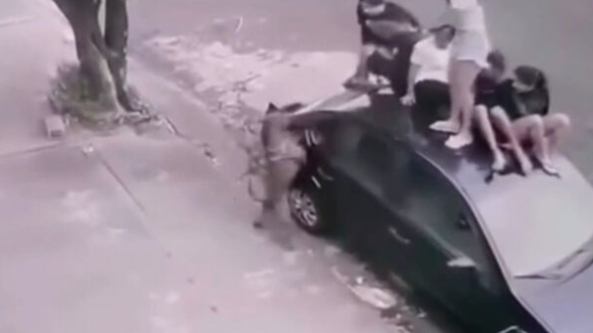 Imagens de uma câmera de segurança mostram o momento em que várias crianças, assustadas, correm e sobem em um carro estacionado na rua para se proteger do animal.