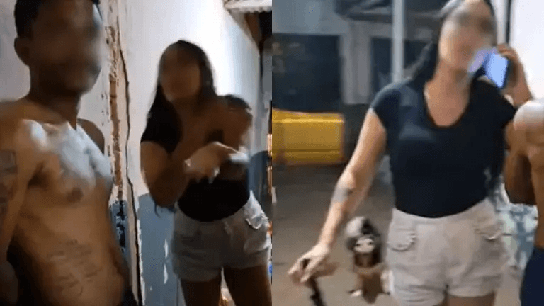 Na gravação, o rapaz é visto encostado na parede, com as mãos posicionadas para trás, enquanto a esposa alega ter sido agredida. A tensão aumenta quando ela se exalta, e sua amiga tenta intervir, buscando acalmá-la. A situação se agrava quando ela aparece empunhando uma faca, momento que gera pânico entre eles.