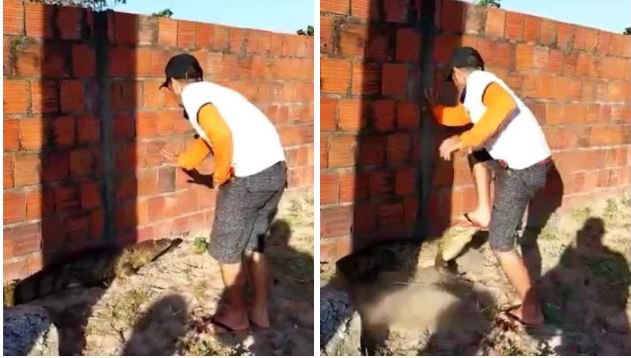 Nas imagens registradas por moradores, é possível ver o animal coado enquanto o homem se aproxima e tenta imobilizá-lo com o pé, quando é surpreendido pelo bicho, que tenta se defender.