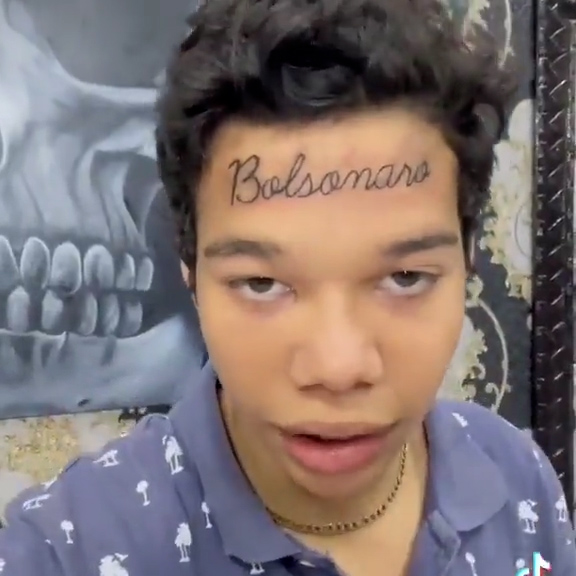 “Rapaziada, acabei de fazer a tatuagem aqui do Bolsonaro. Muito braba, fé para nós”, diz o jovem ao lado do tatuador. O vídeo já conta com quase 500 mil visualizações. Em uma live no Tik Tok, o jovem afirmou que ganhou mil reais para tatuar e “percebeu que o dinheiro não irá cobrir o lazer para retirada”. Já o profissional afirmou que outro cliente irá tatuar o nome de Lula na testa nesta segunda-feira (26).