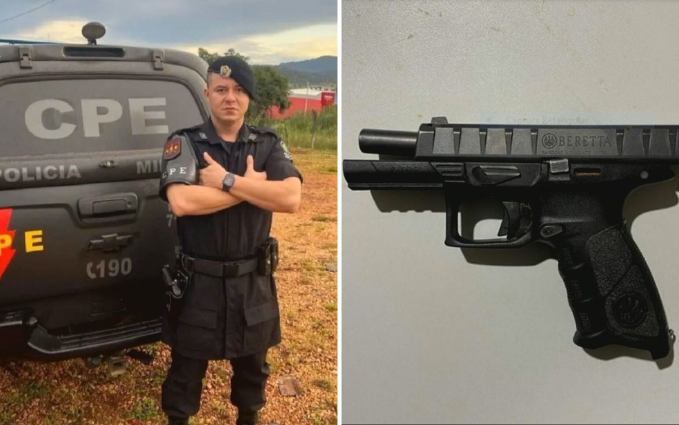 Soldado Tiago White e a arma usada pelo irmão para matá-lo, em Uruaçu — Foto: Reprodução/TV Anhanguera