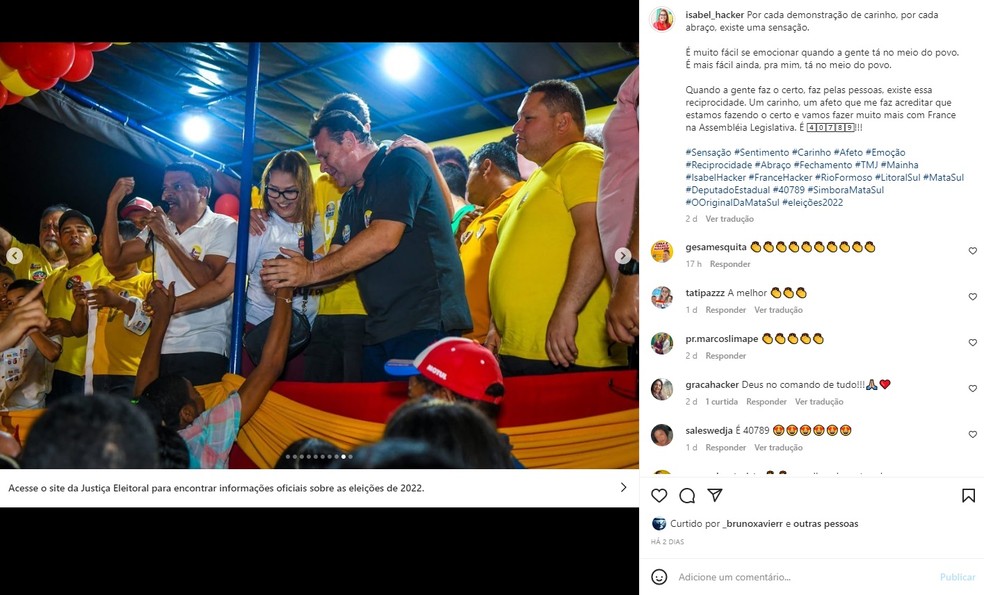 O advogado declara também que Isabel Hacker nunca ofendeu ninguém por diferença de cor, “tampouco suas palavras, nem de longe, demonstram a prática de preconceito racial” e que “tudo não passa de odiosa narrativa política, criada por seus opositores, com intuito de desacreditá-la e prejudicá-la eleitoralmente”