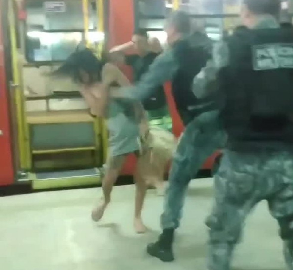 Na imagem, é possível ver que três policiais abordaram passageiros que estavam descendo de um ônibus. A mulher agredida estava acompanhada de um homem, que desceu do veículo como se estivesse sendo abordado, com os braços erguidos. A vítima, então, fala algo a um dos agentes, e um oficial a estapeia no rosto.