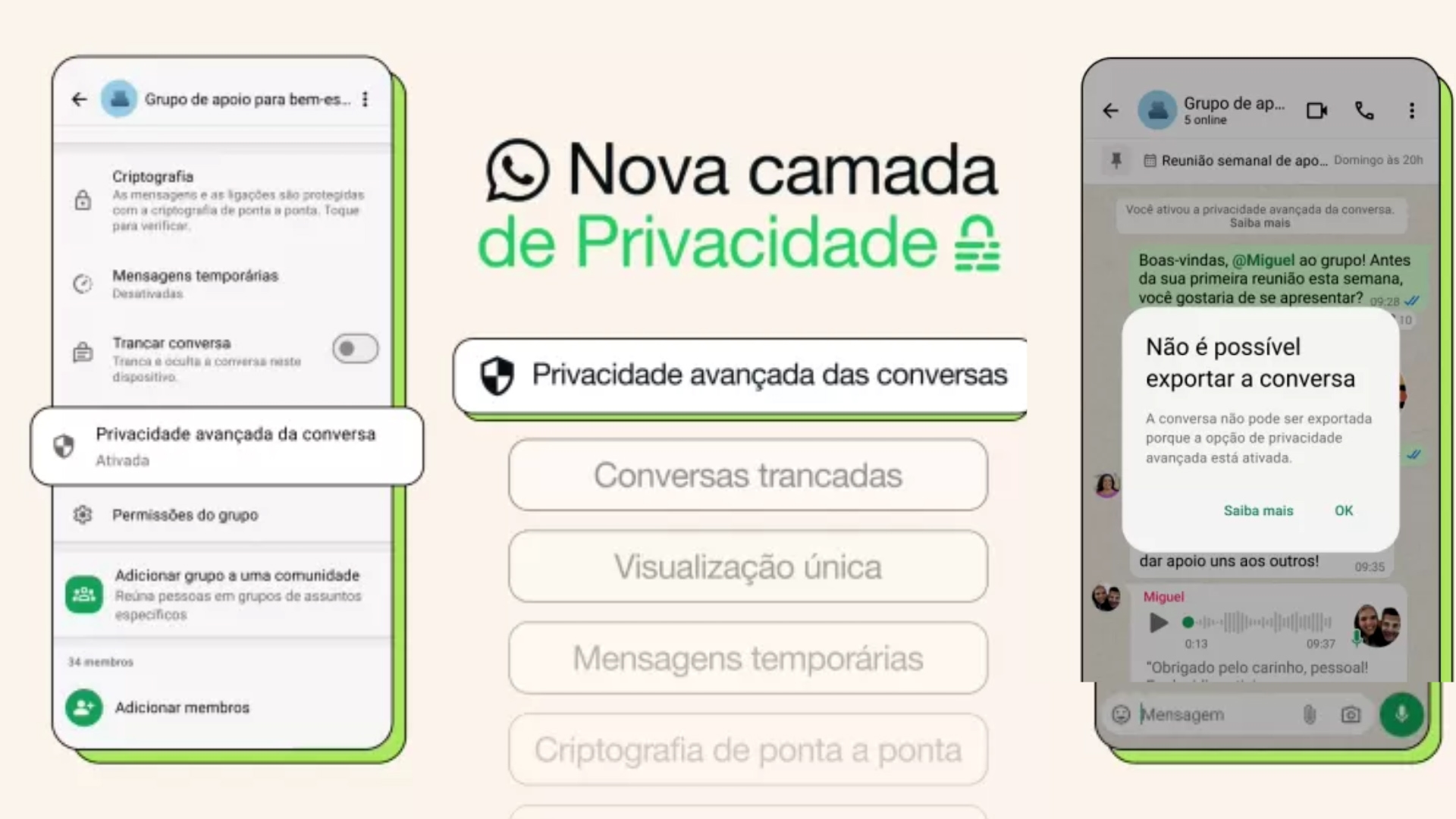 O recurso, chamado de Privacidade avançada da conversa, foi anunciado nesta quarta-feira (23) e está sendo disponibilizado aos poucos para os usuários.
