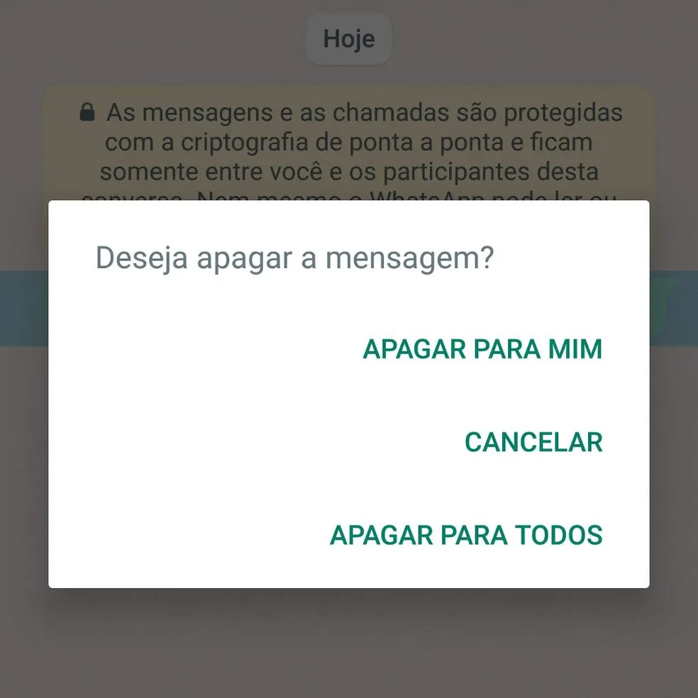 Para apagar uma mensagem, é preciso segurar o dedo no conteúdo enviado para selecioná-lo. No topo da tela, clique no ícone da lixeira e selecione a opção que prefere: “apagar para mim” ou “apagar para todos”.