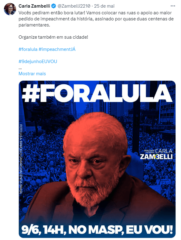 A deputada federal Carla Zambelli (PL-SP) usou suas redes sociais, no último sábado (27), para convocar um ato contra o presidente Lula (PT), no dia 9 de junho, às 14h, na Avenida Paulista, em frente ao Museu de Arte de São Paulo Assis Chateaubriand (Masp), em São Paulo. O evento é uma realização do “Movimento Liberdade”.